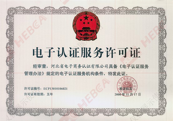 2006年11月17日 河北省電子認證有限公司取得國家信息產業部頒發的《電子認證服務許可證》。