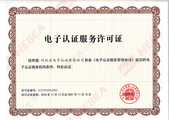 2011年11月17日河北省電子認證有限公司取得國家工業和信息化部換發的《電子認證服務許可證》。